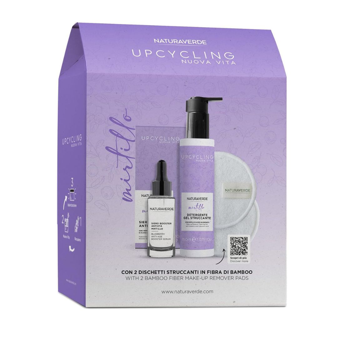 Per la tua Skincare giornaliera. Il cofanetto contiene Gel Detergente Struccante Viso Upcycling Mirtillo 150ml, Siero Viso Booster Upcycling Mirtillo 30ml, Dischetti struccanti. L’estratto valorizza le proprietà uniche del mirtillo, rendendolo un attivo di alto livello cosmetico e ricco di Vitamina E e Antiossidanti, capaci di contrastare la formazione di radicali liberi e di combat- tere i segni dell’età.
