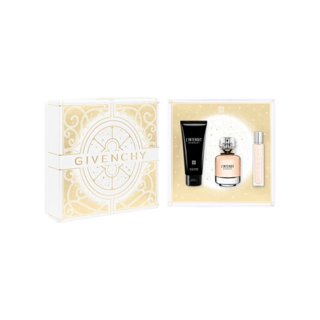 Per queste feste, Givenchy ti invita nel suo piccolo mondo magico: un’edizione in miniatura dell’Hôtel Particulier racchiusa in un elegante set regalo. Regala l’inaspettato con un set di fragranze femminili Givenchy composto da L’Interdit Eau de Parfum, il formato da viaggio ricaricabile e la lozione corpo idratante.