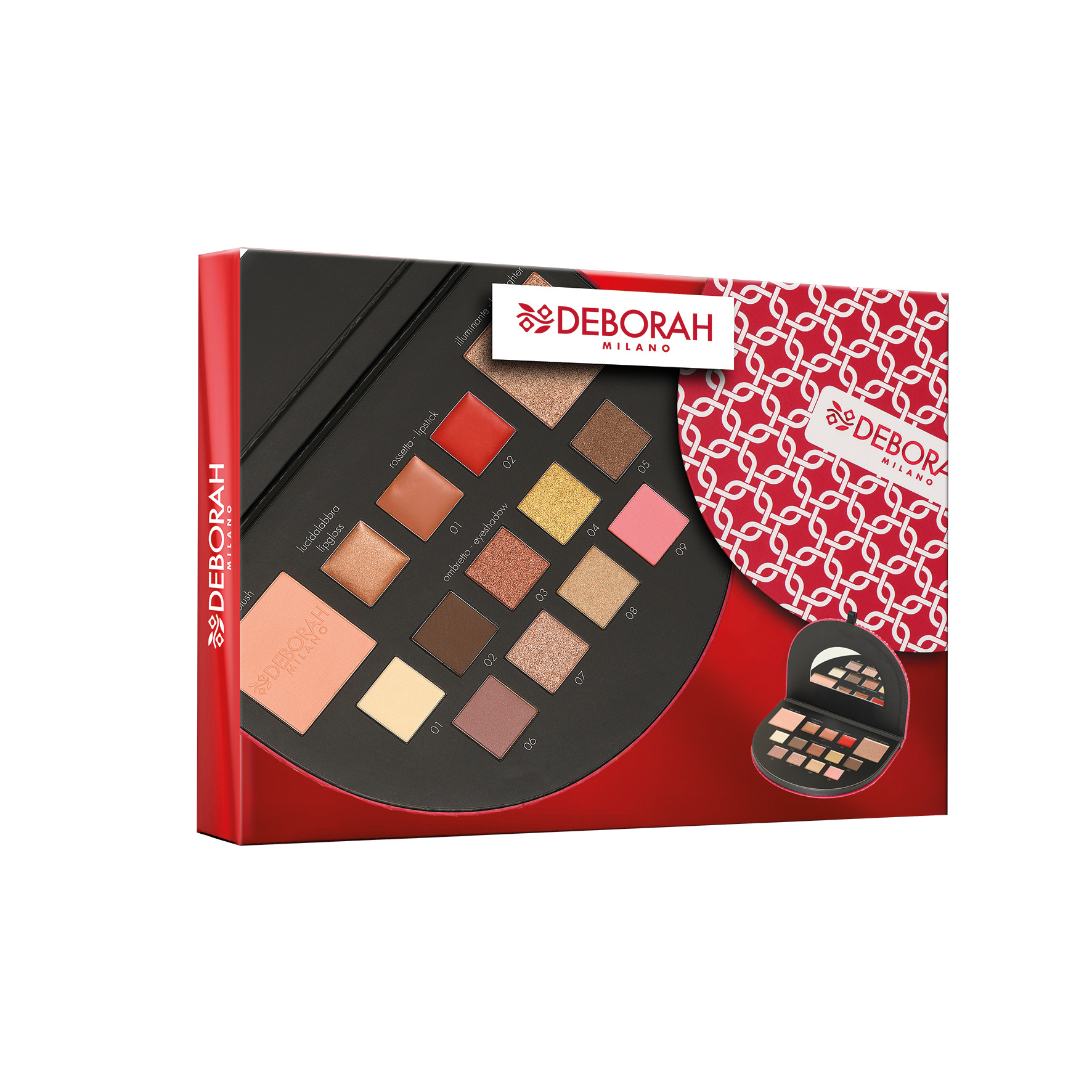 CONTIENE: 9 OMBRETTI + 3 LIP GLOSS/LIPSTICK + 1 BLUSH + 1 ILLUMINANTE